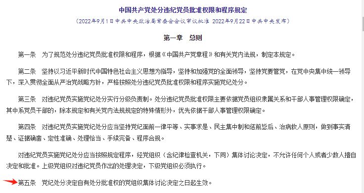 第5條"經紀檢監察工委審理后,派駐紀檢監察組將黨紀處分建議通報駐在部門黨組,由黨組討論決定,黨紀處分建議與黨組的意見不同又不能協商一致的,由中央紀委研究決定。黨紀處分決定應當正式通報派駐紀檢監察組”;