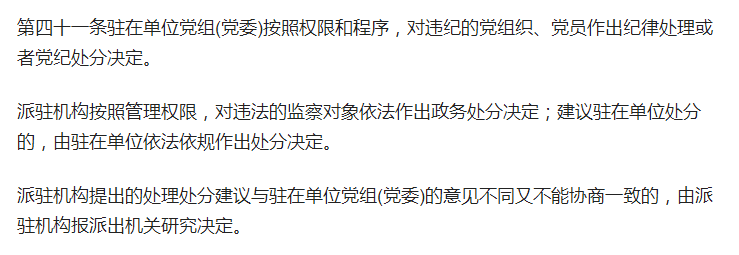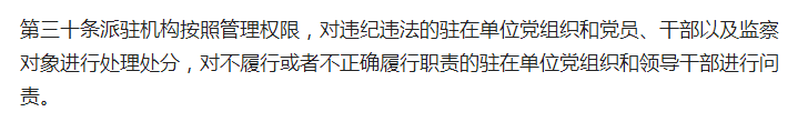 《紀檢監察機關派駐機構工作規則》第30條規定,派駐機構按照管理權限,對違紀違法的駐在單位黨組織和黨員、干部以及監察對象進行處理處分,對不履行或者不正確履行職責的駐在單位黨組織和領導干部進行問責;