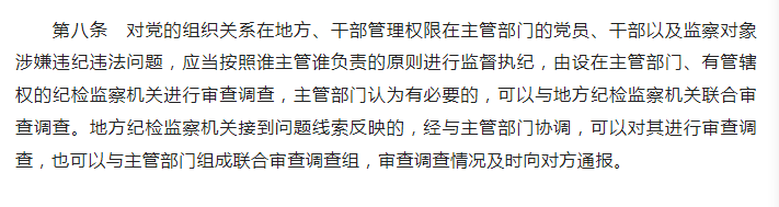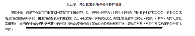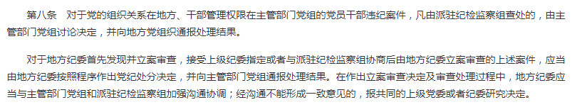 《中國共產黨處分違紀黨員批準權限和程序規定》第40條規定“違紀黨員系實行垂直管理或者實行雙重領導并以上級單位領導為主的單位的干部,同時擔任地方黨委委員、候補委員或者地方紀委委員職務的,由地方紀委依照本規定履行處分審批程序,并將黨紀處分決定抄告主管單位黨組(黨委)。其中,地方紀委立案審查的,應當通過有監督執紀權限的相應派駐紀檢監察組或者主管單位內設紀檢組織征求主管單位黨組(黨委)意見后履行處分審批程序”。