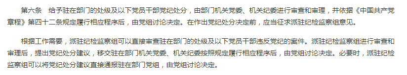 第6條第1款“給予駐在部門的處級及以下黨員干部黨紀處分,由部門機關黨委、機關紀委進行審查和審理,并依據《中國共產黨章程》第四十二條規定履行相應程序后,由黨組討論決定。在作出黨紀處分決定前,應當征求派駐紀檢監察組意見‘;