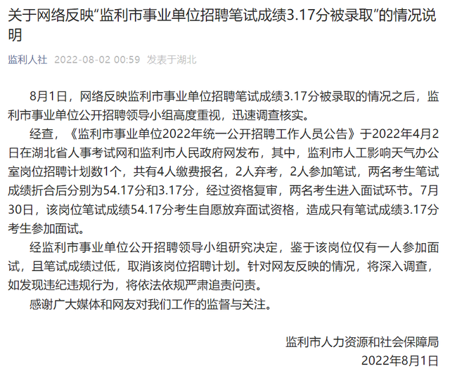 監(jiān)利市人社局關(guān)于網(wǎng)絡(luò)反映事業(yè)單位招聘“筆試成績(jī)3.17分被錄取”的情況說(shuō)明