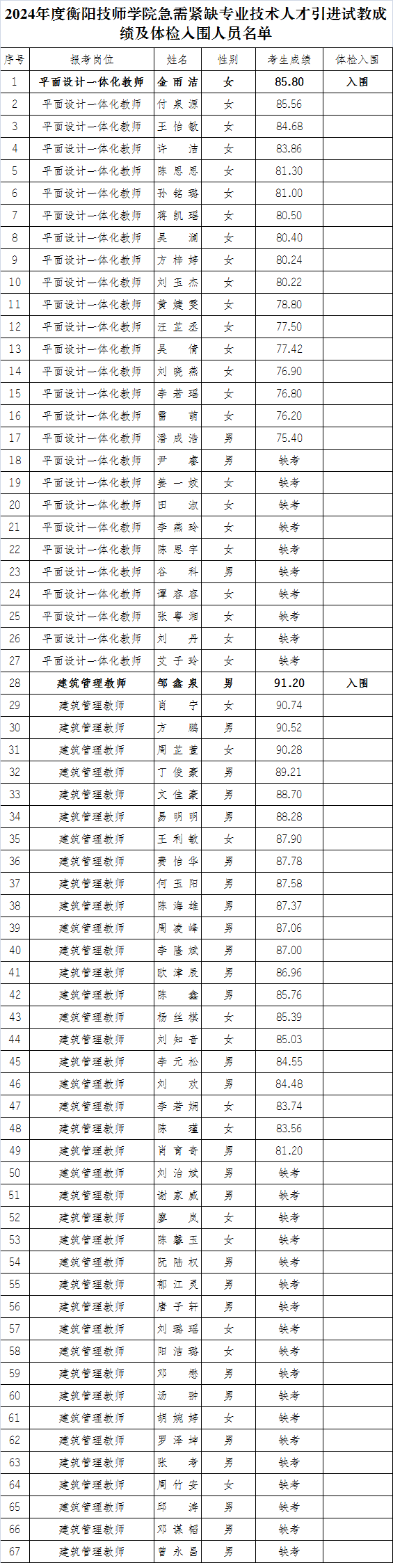 一、2024年度衡陽(yáng)技師學(xué)院急需緊缺專業(yè)技術(shù)人才引進(jìn)試教成績(jī)及體檢入圍人員名單。(詳見(jiàn)附件)