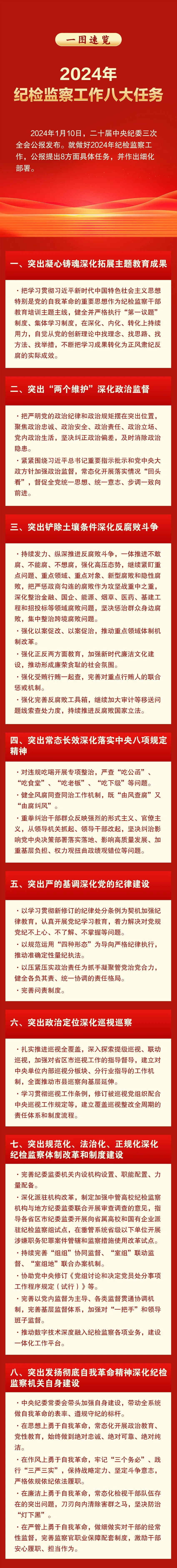 全會提出,2024年是中華人民共和國成立75周年,是實現“十四五”規劃目標任務的關鍵一年。做好今年紀檢監察工作,要堅持以習近平新時代中國特色社會主義思想為指導,全面貫徹落實黨的二十大和二十屆二中全會精神,深入學習貫徹習近平總書記關于黨的自我革命的重要思想,堅決落實全面從嚴治黨戰略方針,深刻領悟“兩個確立”的決定性意義,自覺增強“四個意識”、堅定“四個自信”、做到“兩個維護”,堅持穩中求進工作總基調,鞏固拓展主題教育和教育整頓成果,忠誠履行黨章和憲法賦予的職責,推動健全全面從嚴治黨體系,縱深推進正風肅紀反腐,縱深推進新征程紀檢監察工作高質量發展,為全面推進中國式現代化提供堅強保障。