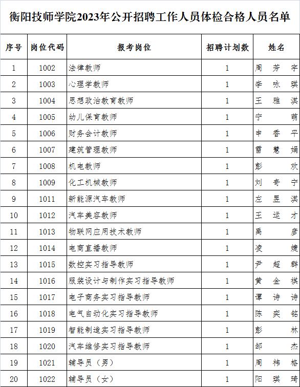 根據《衡陽技師學院2023年公開招聘工作人員公告》和《衡陽技師學院2023年公開招聘工作人員體檢對象名單及體檢相關事項的公告》的規定,確定周芳宇等20名同志為體檢對象,現將體檢結果予以公示。