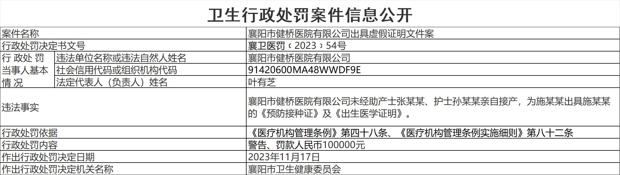 11月6日,網民舉報襄陽健橋醫院(襄城區陳侯巷169號,民營,法定代表人葉某芝,女,55歲)販賣出生醫學證明等問題后,襄陽市立即成立由市委、市政府主要領導任組長、相關市領導為各工作組負責人,市公安、衛健、紀檢監察等部門組成的工作專班,從嚴從快、依法依規開展問題調查、案件偵辦和追責問責等工作。