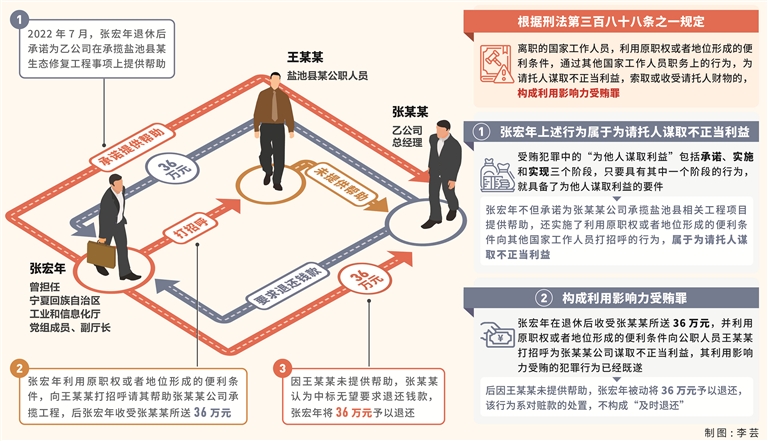 其中,2022年7月,張宏年在退休后接受乙公司總經理張某某請托,承諾為乙公司在承攬鹽池縣某生態修復工程事項上提供幫助,后張宏年利用曾擔任寧夏回族自治區工業和信息化廳黨組成員、副廳長職權或者地位形成的便利條件,向鹽池縣某公職人員王某某打招呼,請其對乙公司中標相關工程項目給予關照。張宏年收受張某某所送現金36萬元。因王某某未提供幫助。一周后,張某某認為中標無望要求退還錢款,張宏年將36萬元予以退還。