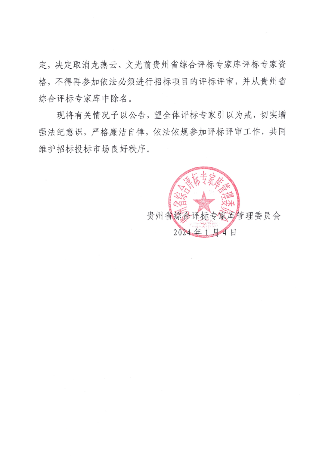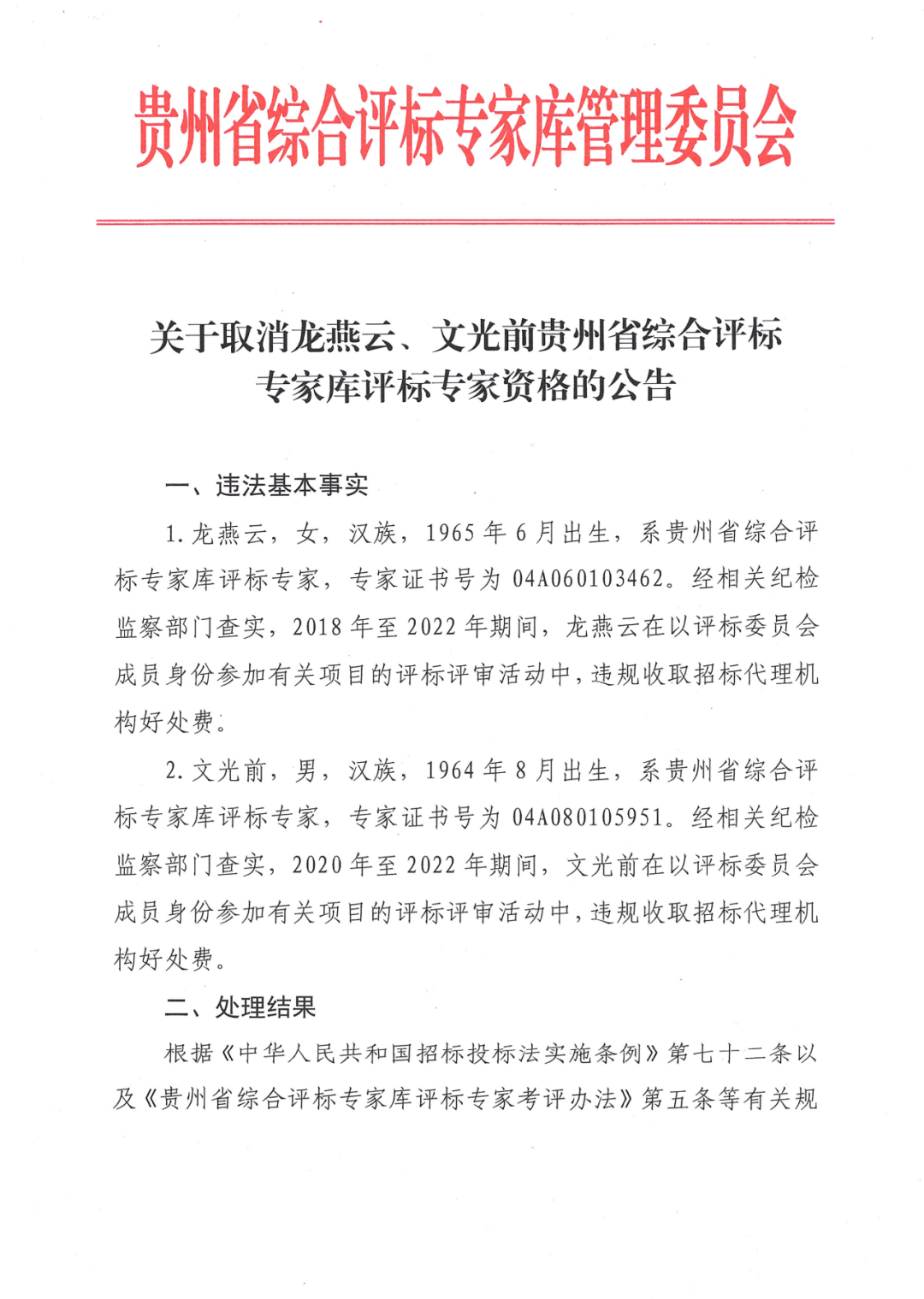 貴州省綜合評(píng)標(biāo)專家?guī)旃芪瘯?huì)關(guān)于取消龍燕云、文光前評(píng)標(biāo)專家資格的公告