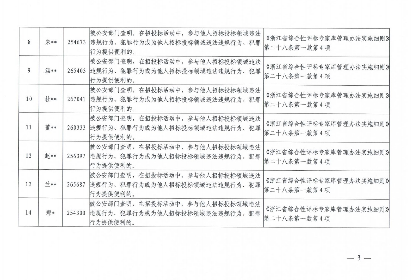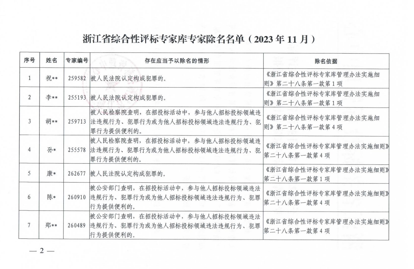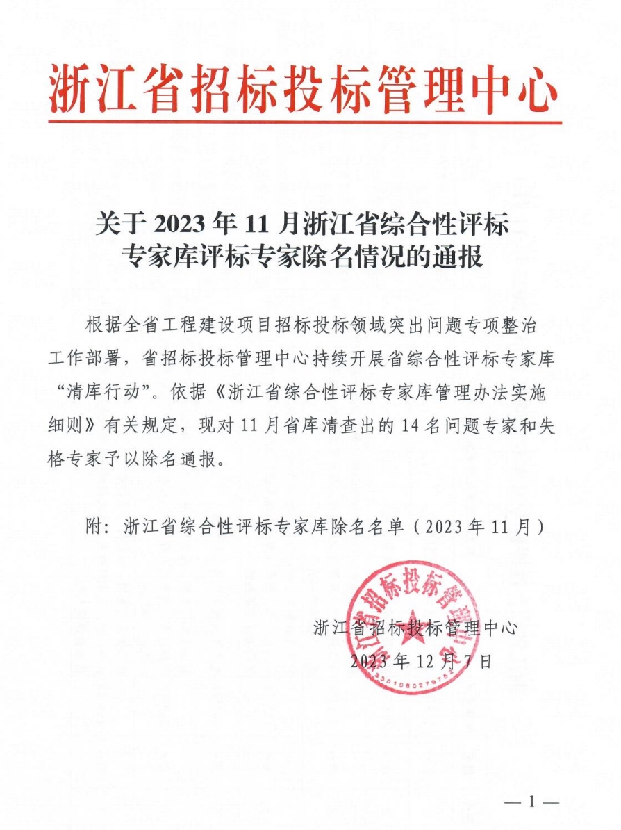 浙江省招標投標管理中心關于2023年11月浙江省綜合性評標專家庫評標專家除名情況的通報