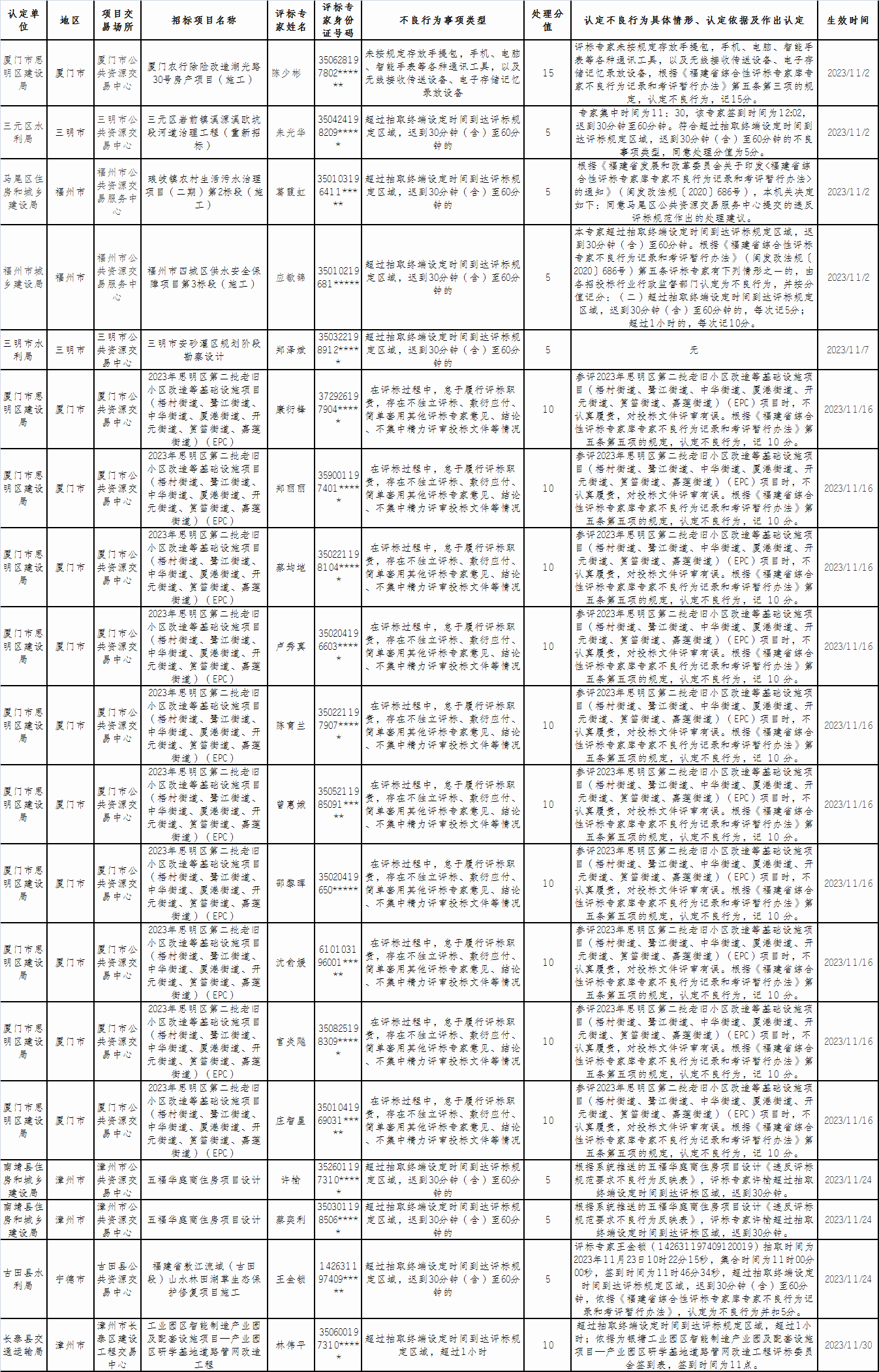 福建省評標專家不良行為公示(2023年11月)