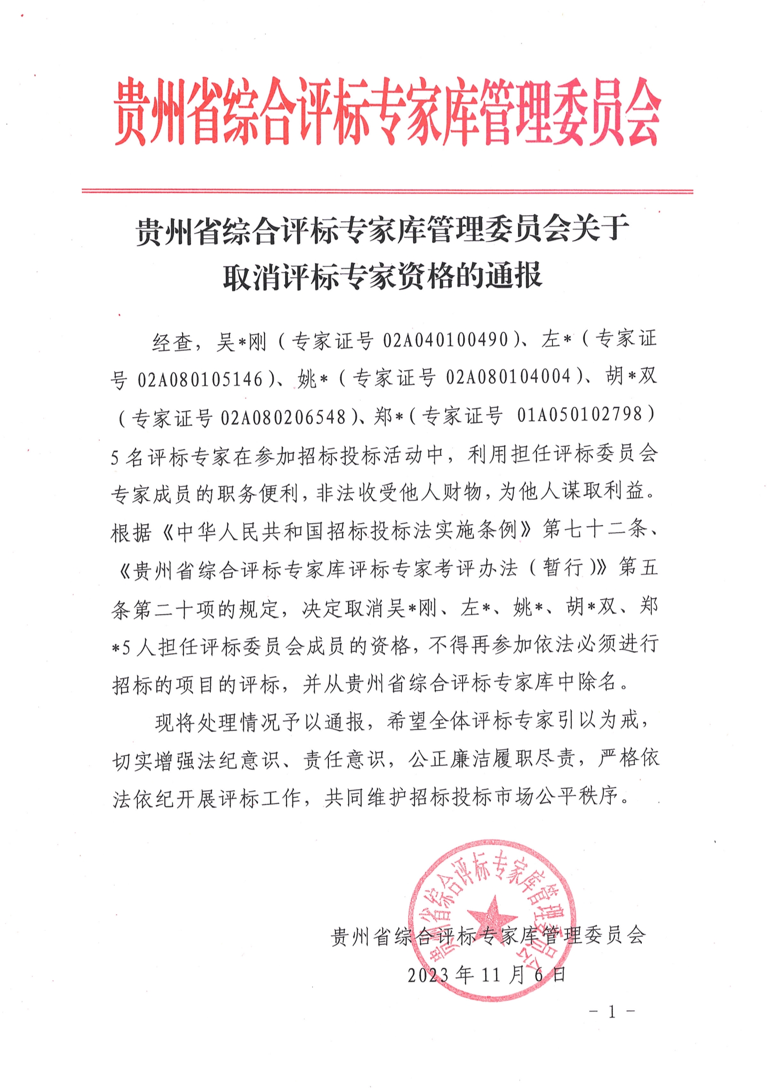 貴州省綜合評標(biāo)專家?guī)旃芾砦瘑T會(huì)關(guān)于取消吳某剛等五名評標(biāo)專家資格的通報(bào)