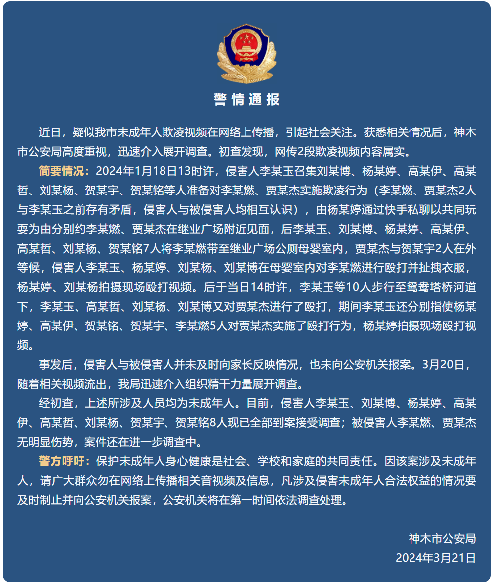 近日,疑似我市未成年人欺凌視頻在網絡上傳播,引起社會關注。獲悉相關情況后,神木市公安局高度重視,迅速介入展開調查。初查發現,網傳2段欺凌視頻內容屬實。 簡要情況:2024年1月18日13時許,侵害人李某玉召集劉某博、楊某婷、高某伊、高某哲、劉某楊、賀某宇、賀某銘等人準備對李某燃、賈某杰實施欺凌行為(李某燃、賈某杰2人與李某玉之前存有矛盾,侵害人與被侵害人均相互認識),由楊某婷通過快手私聊以共同玩耍為由分別約李某燃、賈某杰在繼業廣場附近見面,后李某玉、劉某博、楊某婷、高某伊、高某哲、劉某楊、賀某銘7人將李某燃帶至繼業廣場公廁母嬰室內,賈某杰與賀某宇2人在外等候,侵害人李某玉、楊某婷、劉某楊、劉某博在母嬰室內對李某燃進行毆打并扯拽衣服,楊某婷、劉某楊拍攝現場毆打視頻。后于當日14時許,李某玉等10人步行至鴛鴦塔橋河道下,李某玉、高某哲、劉某楊、劉某博又對賈某杰進行了毆打,期間李某玉還分別指使楊某婷、高某伊、賀某銘、賀某宇、李某燃5人對賈某杰實施了毆打行為,楊某婷拍攝現場毆打視頻。 事發后,侵害人與被侵害人并未及時向家長反映情況,也未向公安機關報案。3月20日,隨著相關視頻流出,我局迅速介入組織精干力量展開調查。 經初查,上述所涉及人員均為未成年人。目前,侵害人李某玉、劉某博、楊某婷、高某伊、高某哲、劉某楊、賀某宇、賀某銘8人現已全部到案接受調查;被侵害人李某燃、賈某杰無明顯傷勢,案件還在進一步調查中。 警方呼吁:保護未成年人身心健康是社會、學校和家庭的共同責任。因該案涉及未成年人,請廣大群眾勿在網絡上傳播相關音視頻及信息,凡涉及侵害未成年人合法權益的情況要及時制止并向公安機關報案,公安機關將在第一時間依法調查處理。