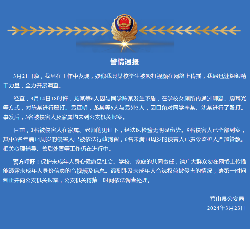 四川省營山縣公安局通報“學生在女廁所被毆打”:9名侵害人已全部到案