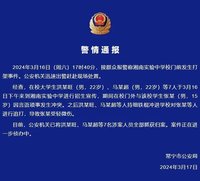 常寧市公安局關于湘南實驗中學校門前打架事件的警情通報