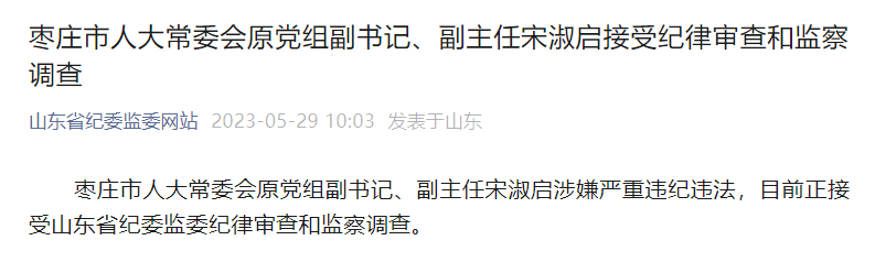 經(jīng)山東省委批準(zhǔn),山東省紀(jì)委監(jiān)委對棗莊市人大常委會(huì)原黨組副書記、副主任宋淑啟嚴(yán)重違紀(jì)違法問題進(jìn)行了立案審查調(diào)查。
