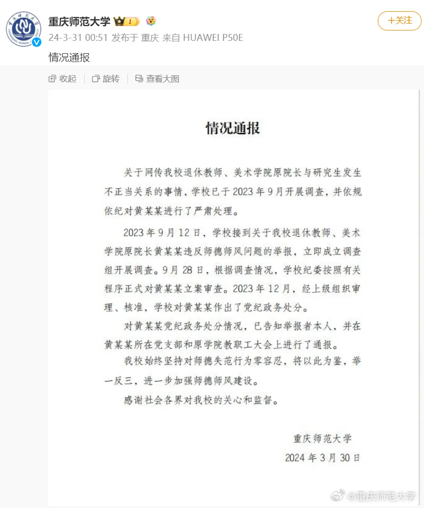重慶師范大學關于美術學院原院長黃某某違反師德師風問題舉報的情況通報
