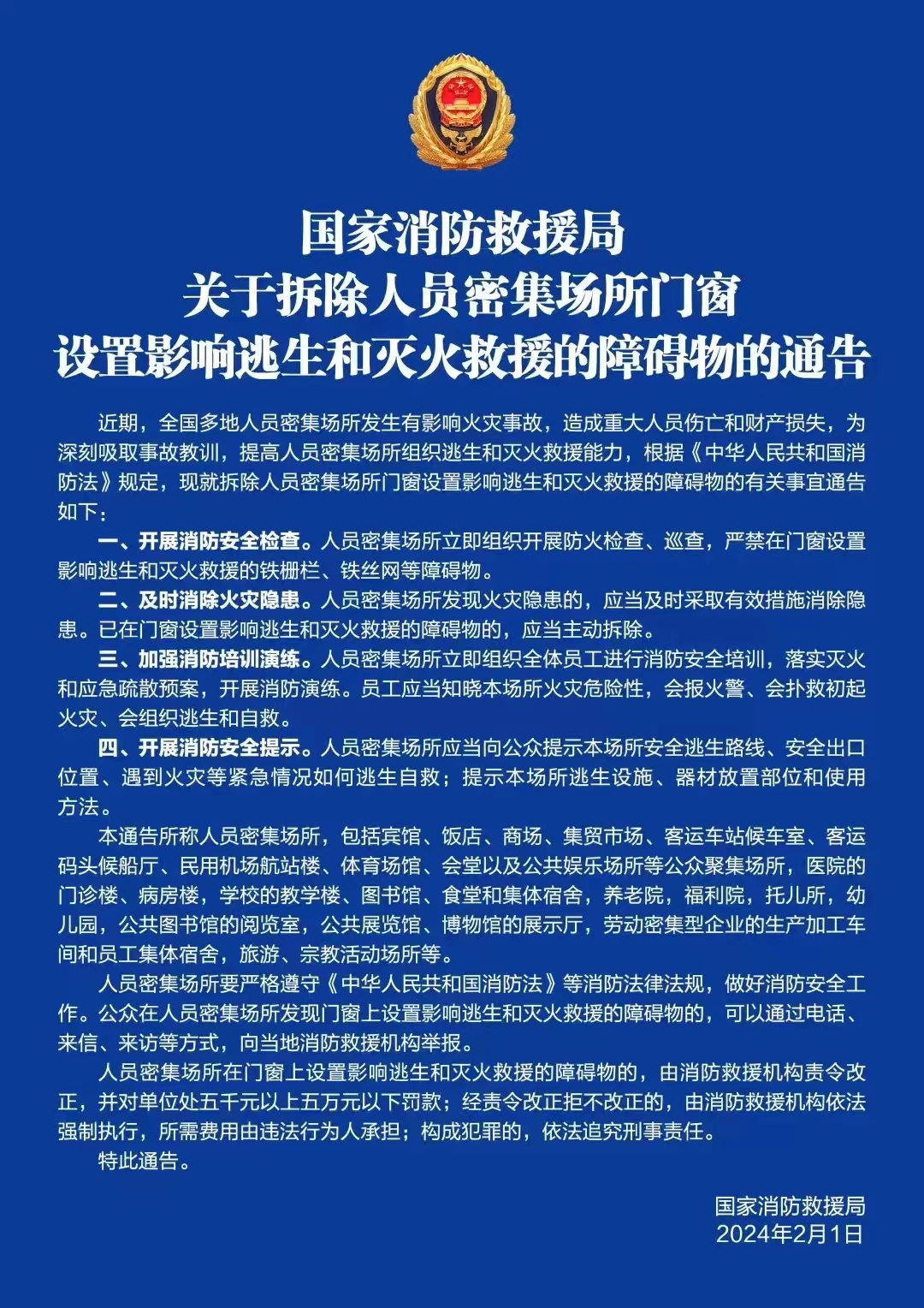 關(guān)于拆除人員密集場(chǎng)所門(mén)窗設(shè)置影響逃生和滅火救援的障礙物的通告