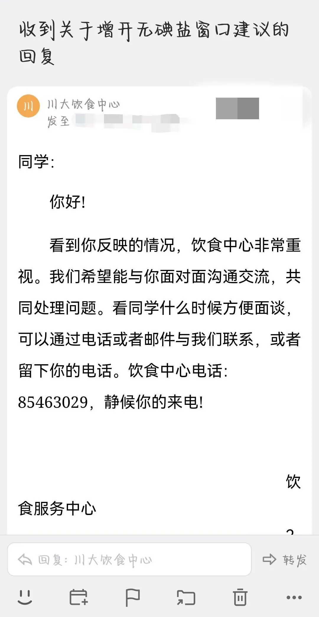 四個(gè)月前,來(lái)自輕工科學(xué)與工程學(xué)院的L同學(xué)檢查出甲亢,吃藥三個(gè)月后,病情慢慢好轉(zhuǎn),但復(fù)查后醫(yī)生告知她仍需繼續(xù)吃藥,并且生活中的各個(gè)方面都要多注意。 思來(lái)想去,最終L同學(xué)決定從飲食方面下功夫。但在寢室住宿不管是從時(shí)間精力還是從條件上來(lái)說(shuō)都無(wú)法自己做飯。于是,L同學(xué)抱著試一試的想法,給學(xué)校反映了自己的訴求。 不久后,L同學(xué)收到了川大飲食服務(wù)中心的回信。