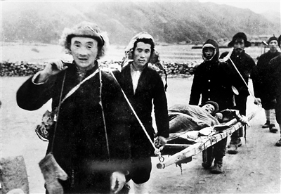 圖為抗美援朝擔架隊運送傷員的情景