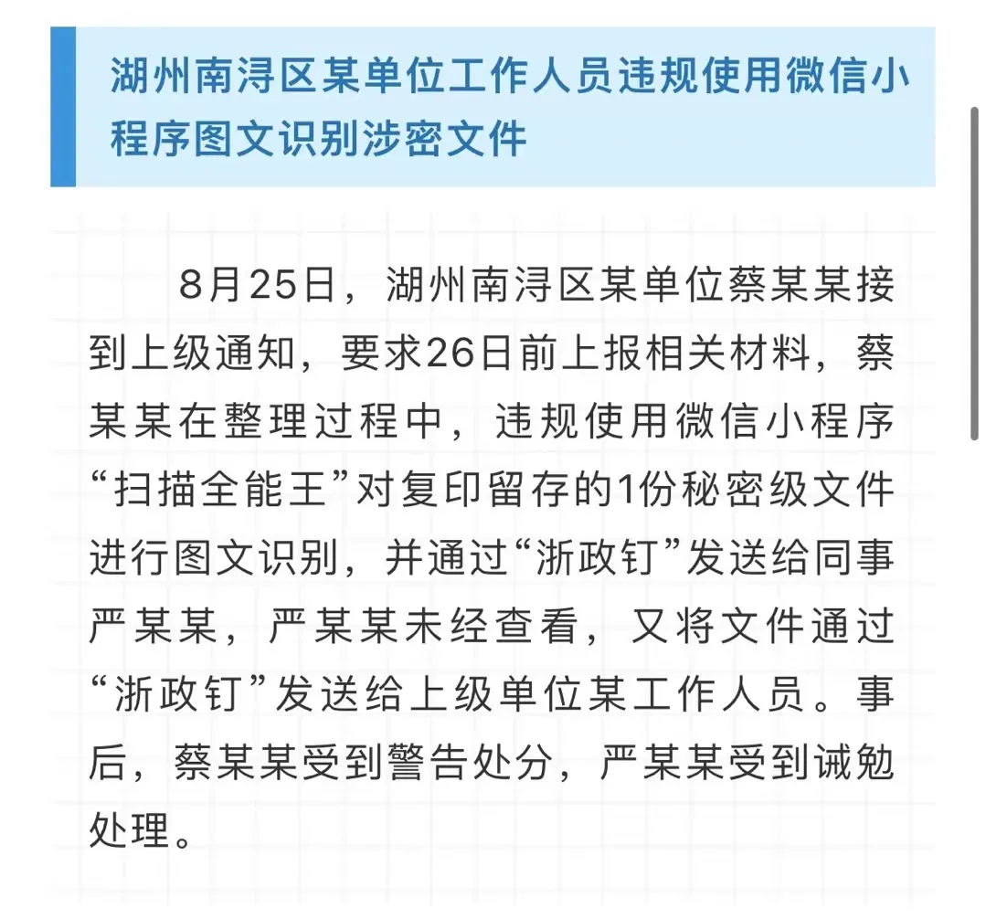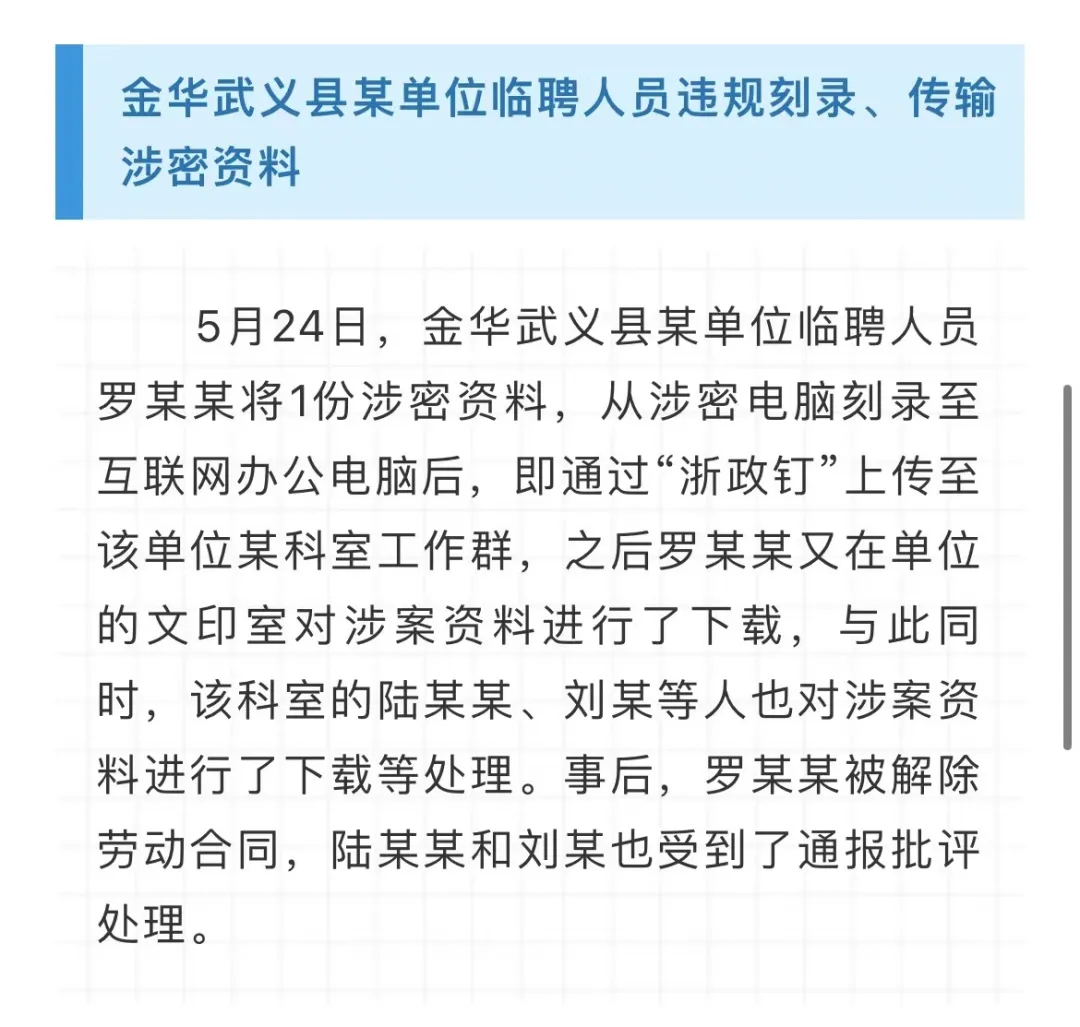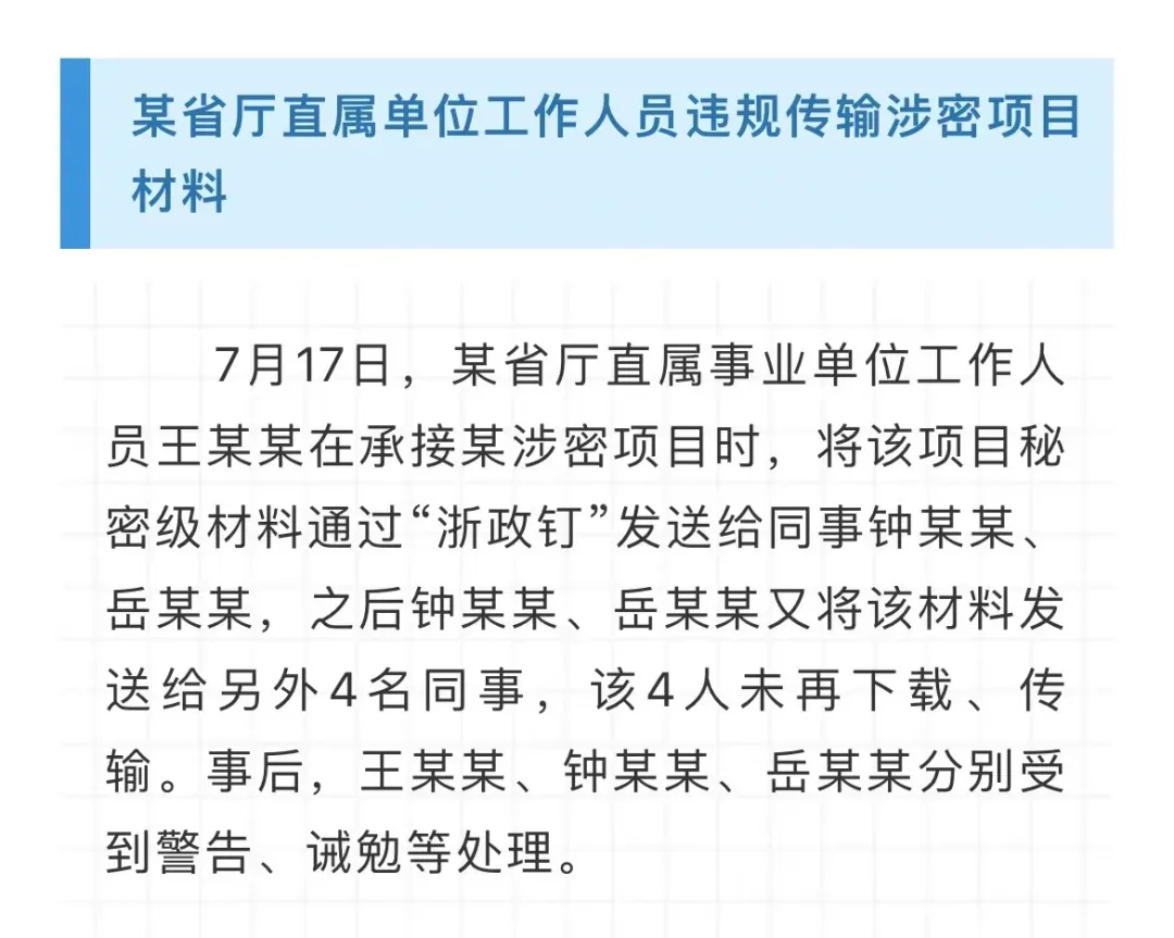 2023年,浙江省委保密辦、省國家保密局依紀依法依規查處了一批違反保密法律法規的案件,為充分發揮懲前毖后的警示教育作用,現將7起典型案例通報如下。