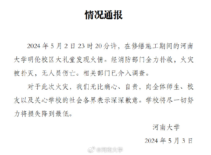5月2日,河南大學(xué)明倫校區(qū)大禮堂發(fā)生火災(zāi)事故,影響重大。國務(wù)院安委會(huì)決定,對(duì)該起火災(zāi)事故查處實(shí)行掛牌督辦,并派出督辦組赴當(dāng)?shù)囟酱僦笇?dǎo)河南省調(diào)查組工作,要求科學(xué)嚴(yán)謹(jǐn)盡快查明事故原因,依法依規(guī)嚴(yán)肅追責(zé)問責(zé)。