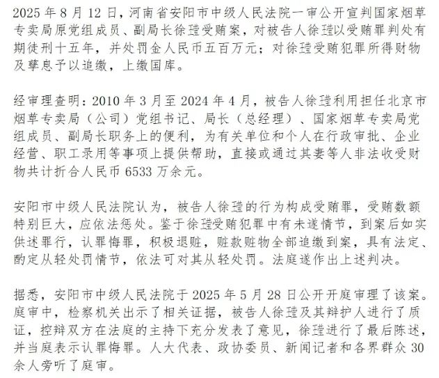 國家煙草專賣局原黨組成員、副局長徐?涉嫌受賄一案,由國家監(jiān)察委員會(huì)調(diào)查終結(jié),經(jīng)最高人民檢察院指定,由河南省安陽市人民檢察院審查起訴。近日,安陽市人民檢察院已向安陽市中級人民法院提起公訴。