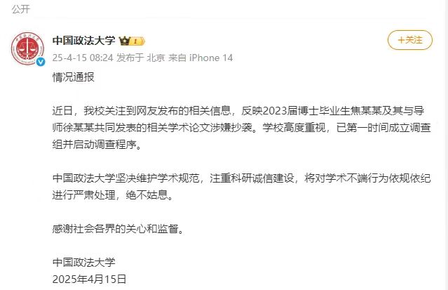 中國政法大學對網友反映相關論文涉嫌抄襲的情況通報