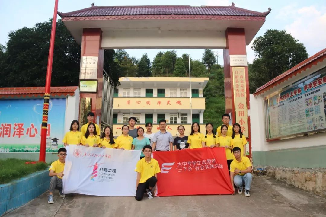 茂南區團委副書記、掛職金秀縣委辦副主任江靈進,團縣委掛職副書記韋曉玲,團縣委干事李衛洋,金田小學陶永英老師與逐夢心光的全體隊員合影