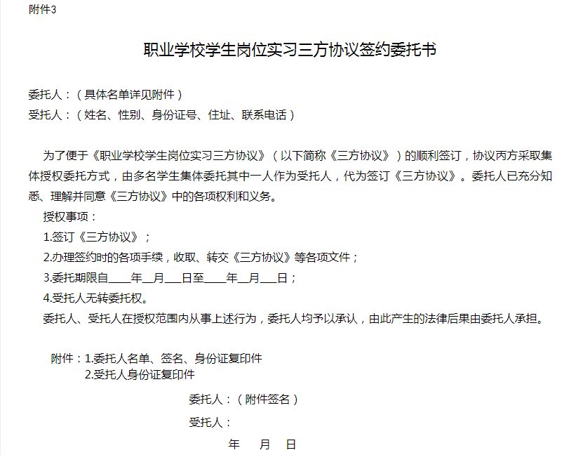 3.職業(yè)學(xué)校學(xué)生崗位實習(xí)三方協(xié)議簽約委托書