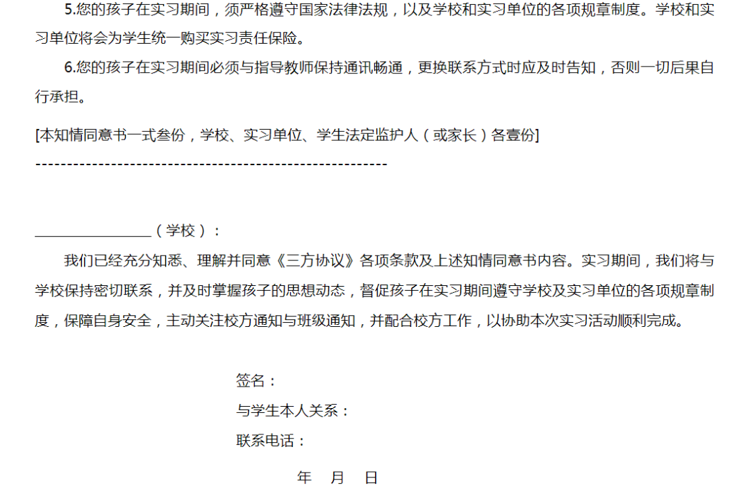4.在簽訂本協(xié)議時,丙方應(yīng)將實習(xí)情況告知法定監(jiān)護人(或家長),并取得法定監(jiān)護人(或家長)簽字的知情同意書作為本協(xié)議的附件。