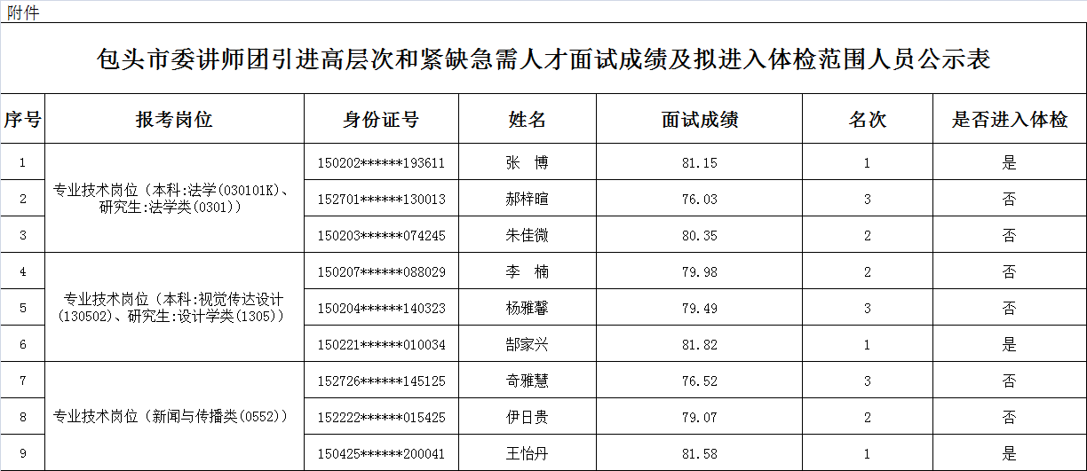 根據(jù)《包頭市委講師團(tuán)面向社會公開引進(jìn)高層次和緊缺急需專業(yè)人才公告》,包頭市委講師團(tuán)引進(jìn)高層次和緊缺急需人才面試工作已完成,現(xiàn)將面試成績及擬進(jìn)入體檢范圍人員名單(詳見附件)公示如下: