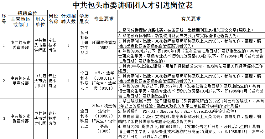 本次計劃公開引進(jìn)高層次和緊缺急需人才3人,具體崗位及要求詳見《中共包頭市委講師團(tuán)人才引進(jìn)崗位表》(下文簡稱《崗位表》,詳見附件1)。