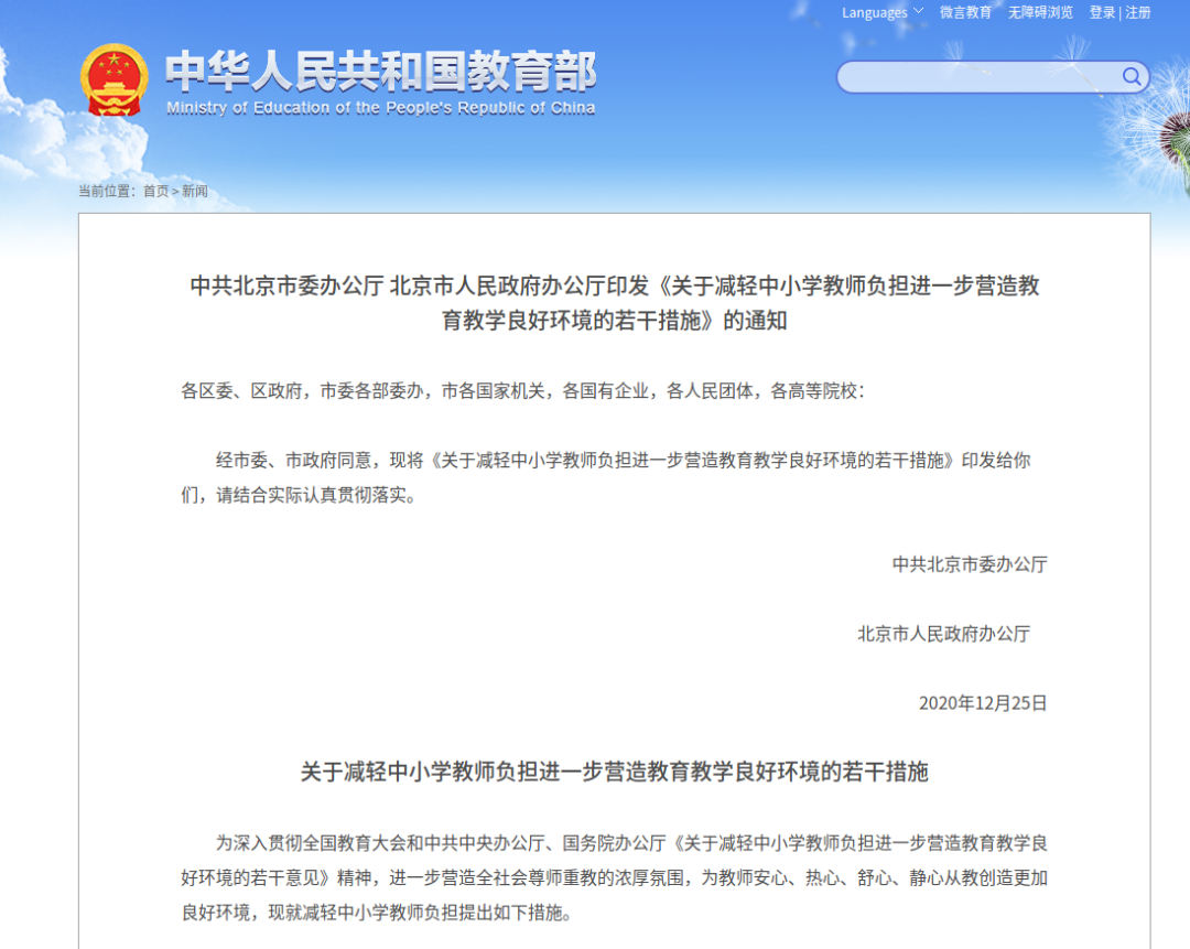 日前,北京市委教工委市教委發布《關于減輕中小學幼兒園教師非教育教學負擔營造教育教學良好環境的若干措施》,提出要控制督查檢查評比考核事項總量和頻次,寒暑假法定節假日及平時原則上不安排教師值班,支持教師正當有效實施教育懲戒權等內容。一起來看↓↓