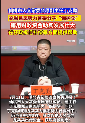 二、仙桃市人大常委會原黨組成員、副主任丁克勤充當黑惡勢力“保護傘”問題。