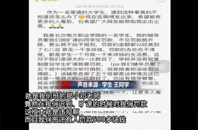 記者從學生們口中得知,向學生收罰款的是長沙南方職業學院2014級市場營銷班輔導員鄧中秋,班級QQ群中名為“鄧老師”的人正是他。對于學生們的質疑,這位鄧老師是這么說的。