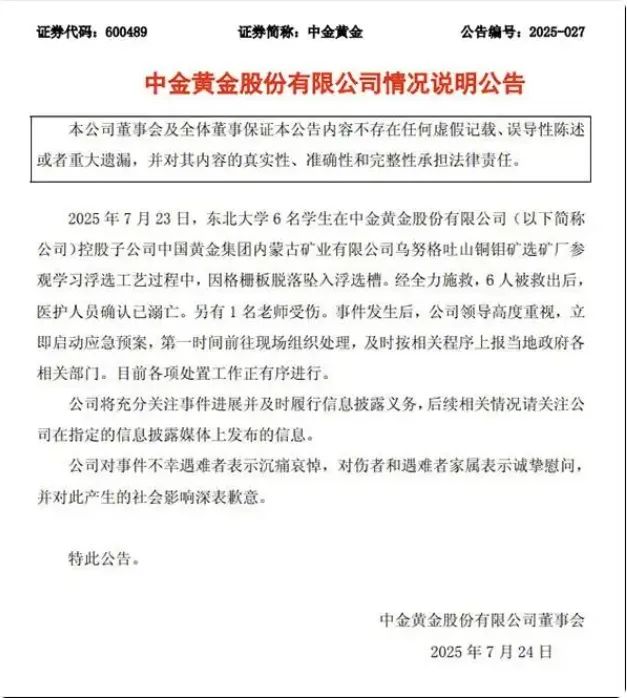 7月23日,中國黃金集團內蒙古礦業(yè)有限公司烏努格吐山銅鉬礦選礦廠發(fā)生一起6人死亡、1人受傷的事故。
