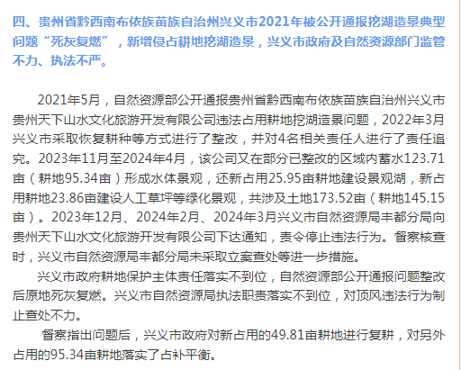 3.貴州省黔西南布依族苗族自治州興義市侵占耕地挖湖造景整改存在形式主義,問題反復發生。