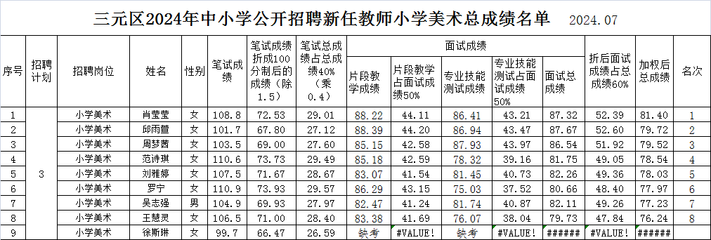 附件:三元區2024年中小學公開招聘新任教師小學美術總成績名單。