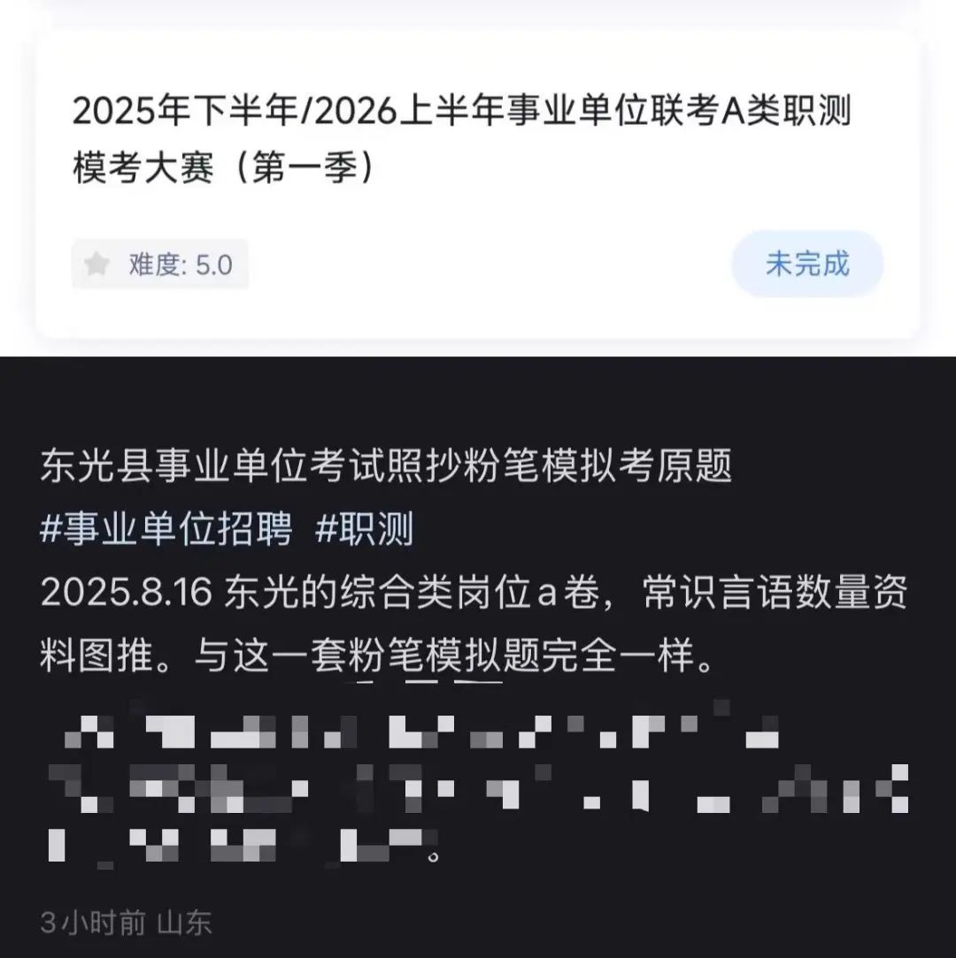8月17日,有多名網友發帖稱在8月16日舉行的河北省滄州市東光縣事業單位公開招聘考試中,考試試題與粉筆APP一模考題一致。有網友表示,“東光事業編試題違規抄襲某機構模考題,就直接照抄照搬啊,題的順序也不改改。”