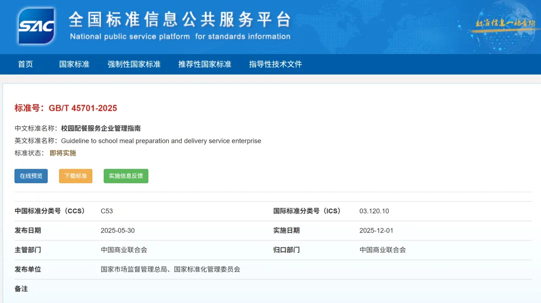 近日,市場監(jiān)管總局批準(zhǔn)發(fā)布《校園配餐服務(wù)企業(yè)管理指南》國家標(biāo)準(zhǔn),這是國家首個(gè)專門針對校園配餐的國家標(biāo)準(zhǔn),將于2025年12月1日正式實(shí)施。該指南適用于為中小學(xué)、幼兒園學(xué)生提供學(xué)生餐制作及配送服務(wù)的校園配餐服務(wù)企業(yè)。
