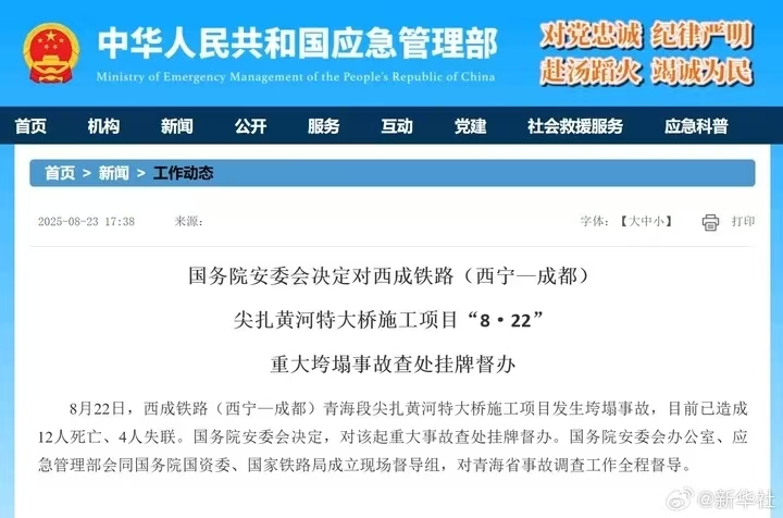 國務(wù)院安委會決定對西成鐵路(西寧—成都)尖扎黃河特大橋施工項目“8·22”重大垮塌事故查處掛牌督辦
