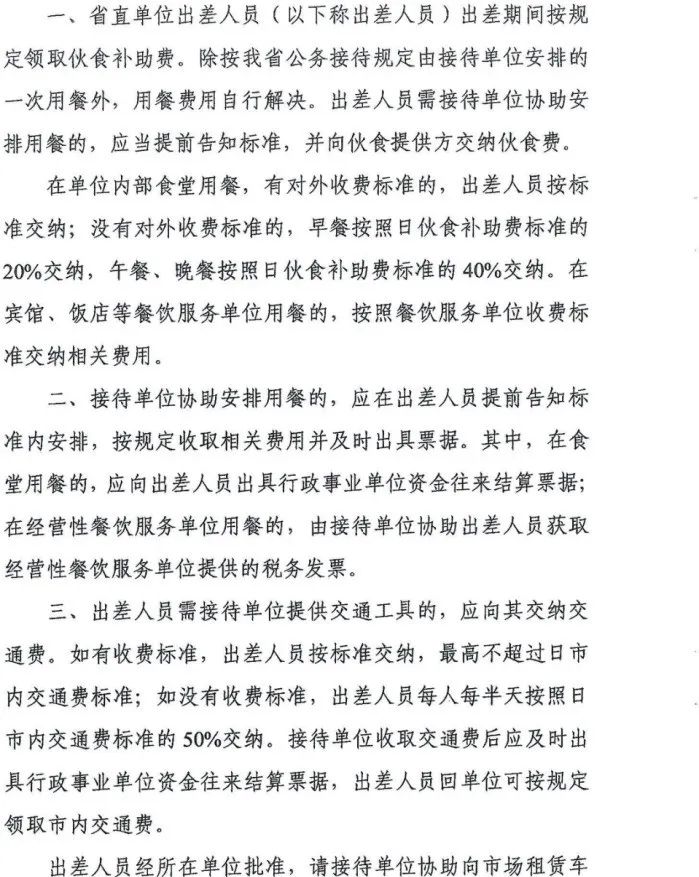 一、省直單位出差人員(以下稱出差人員)出差期間按規定領取伙食補助費。除按我省公務接待規定由接待單位安排的一次用餐外,用餐費用自行解決。出差人員需接待單位協助安排用餐的,應當提前告知標準,并向伙食提供方交納伙食費。