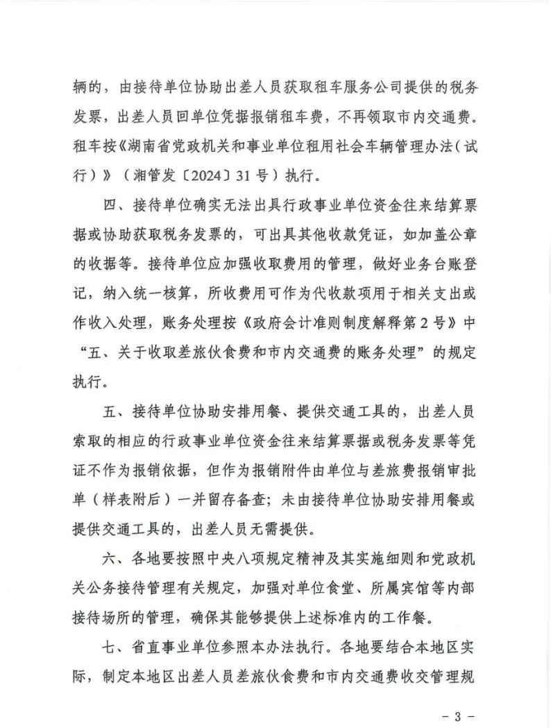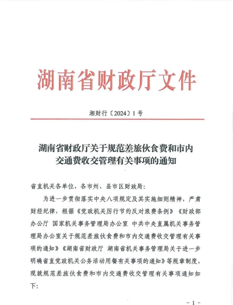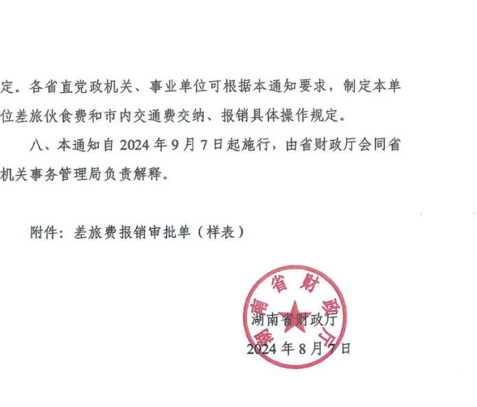 為進一步規范省直單位差旅費管理,嚴肅財經紀律,近日,湖南省財政廳印發《關于規范差旅伙食費和市內交通費收交管理有關事項的通知》(湘財行〔2024〕1號,以下簡稱《通知》),在《湖南省省直機關差旅費管理辦法》基礎上,對差旅伙食費和市內交通費收交管理作了進一步明確,規定自9月7日起,省直單位出差人員在接待單位協助安排用餐和用車情況下,須嚴格按規定,分類依標準交納差旅伙食費和市內交通費。