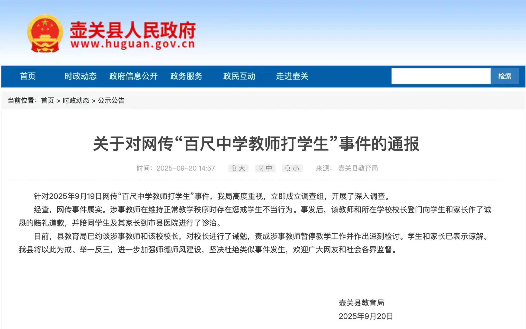 壺關縣教育局關于對網傳“百尺中學教師打學生”事件的通報