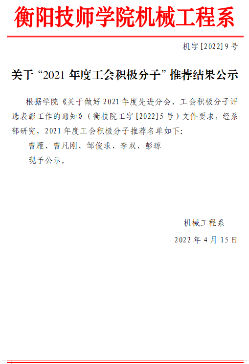 機械工程系“2021年度工會積極分子”推薦結果公示