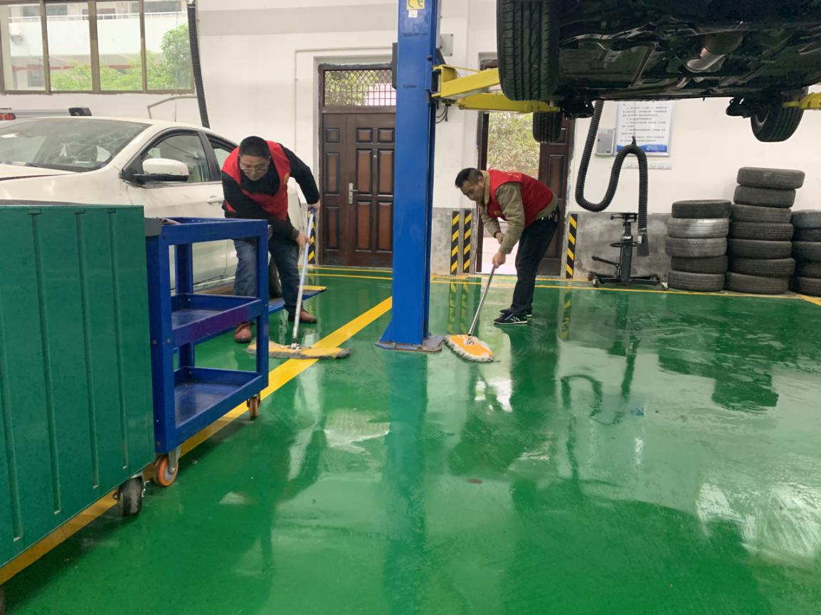 為讓同學(xué)們有一個(gè)干凈整潔的實(shí)訓(xùn)環(huán)境,教師們分別從實(shí)訓(xùn)中心處領(lǐng)取掃帚、拖把、抹布等清潔工具,分成四個(gè)小組在汽車實(shí)訓(xùn)場(chǎng)地打掃衛(wèi)生、擦拭車輛灰塵,規(guī)范工具擺放。