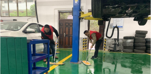 為讓同學們有一個干凈整潔的實訓環境,教師們分別從實訓中心處領取掃帚、拖把、抹布等清潔工具,分成四個小組在汽車實訓場地打掃衛生、擦拭車輛灰塵,規范工具擺放。