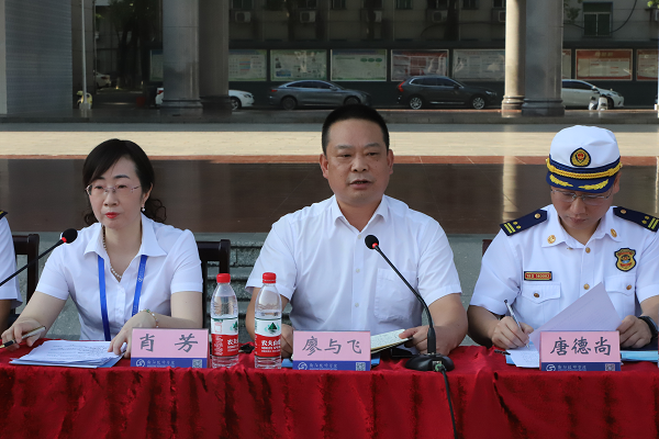 大會(huì)在雄壯的國(guó)歌中拉開帷幕。廖與飛代表學(xué)院對(duì)全體2022級(jí)新生表示熱烈歡迎,對(duì)大力支持學(xué)院軍訓(xùn)工作的校隊(duì)合作單位——衡陽(yáng)市消防救援支隊(duì)的領(lǐng)導(dǎo)們和全體教官們表示誠(chéng)摯的歡迎和衷心感謝。他指出,軍訓(xùn)是新生入學(xué)的第一堂必修課,希望同學(xué)們要以積極的姿態(tài)、昂揚(yáng)的斗志投身到軍訓(xùn)當(dāng)中去,堅(jiān)決完成軍訓(xùn)任務(wù),要加強(qiáng)團(tuán)結(jié),互相關(guān)愛,在軍訓(xùn)中培養(yǎng)集體主義思想,鍛造集體榮譽(yù)感,爭(zhēng)當(dāng)優(yōu)秀連隊(duì)。希望通過(guò)軍訓(xùn)不斷提高同學(xué)們的思想政治覺悟,激發(fā)同學(xué)們的愛國(guó)熱情,增強(qiáng)同學(xué)們的國(guó)防觀念和國(guó)家安全意識(shí),對(duì)同學(xué)們進(jìn)行愛國(guó)主義、集體主義和革命英雄主義教育,培養(yǎng)同學(xué)們艱苦奮斗的作風(fēng),養(yǎng)成良好的組織紀(jì)律觀念和生活習(xí)慣。