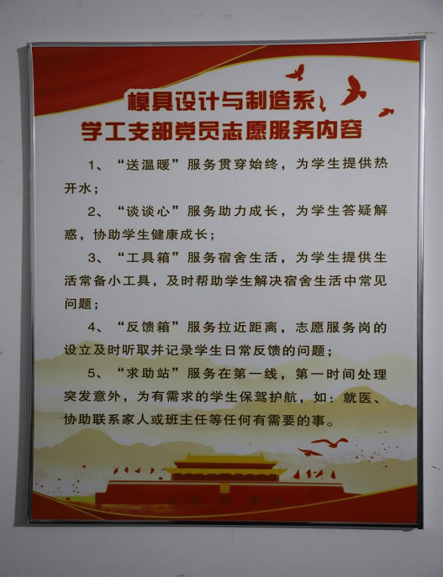 走進男生宿舍4棟1樓,“黨員志愿服務崗”幾個字特別醒目。模具設計與制造系努力實現“一名黨員一份責任,一名黨員一面旗幟”,王客客主動向組織申請住進學生宿舍,與學生同吃同住,以便更好服務于學生,為同學們解決生活、學習、思想等方面的困難,并積極動員在校學生黨員和入黨積極分子在晚自習下課后,堅持在服務崗實習一小時,將“黨員志愿服務崗”打造成富有特色的學習和育人陣地,在學生黨員中掀起學黨史的熱潮,并且真正把“我為群眾辦實事”落在實處。