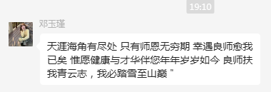 此刻,我想引用鄧玉瑾同學微信中的一句話“良師扶我青云志,我必踏雪至山巔”!今天你們以學校為榮,明天學校將以你們為傲!祝你們前程似錦!越走越輝煌!